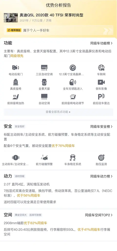 好了,说了这么多,如果你正在寻找一辆既有颜值又有实力的二手车,那么这辆奥迪Q5L 2020款 40 TFSI 荣享时尚型绝对是一个不错的选择。它有着奥迪品牌的保障,有着中配车型应有的配置,更重要的是,它还能给你带来那种不一样的驾驶体验。想象一下,在一个阳光明媚的日子里,你驾驶着这辆奥迪Q5L,穿梭在城市的街头巷尾,那感觉,简直了!所以,如果你正好在找一辆二手车,不妨来看看这辆奥迪Q5L吧!