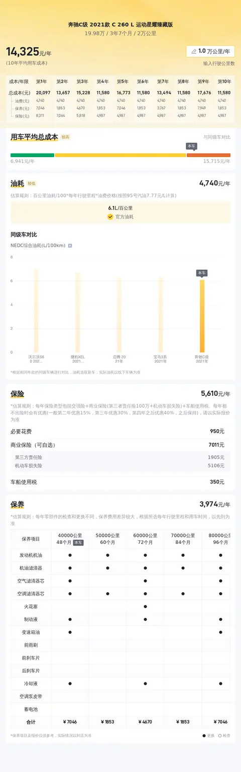 在用车成本上,该车官方公布的百公里油耗为6.1升,按每年行驶一万公里,油价92号7.85元/L计算,每年燃油费用约为4731元,加上每年保险约5384元,以及每年保养约4131元,平均年度用车成本约14246元,与同级别车相比,用车成本适中。