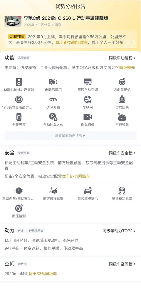 这台奔驰C级 2021款 C 260 L 运动星耀臻藏版外观为白色,上牌地为南京,上牌日期2021年9月,表显里程2万公里,未过户。新车指导价35.68万,新车含税价38.97万,现在的二手车报价19.98万,可节省税费4.11万。