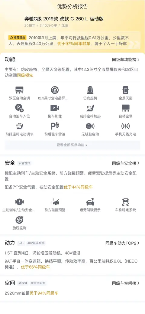 接下来,让我们深入了解这辆二手奔驰C级的具体状况。这辆车是2019款改款C 260 L运动版,采用白色车身,2019年9月在沈阳上牌,至今行驶了3.4万公里,此车还未有过过户记录。新车指导价为34.68万元,现二手车报价为16.98万元,价格还是比较诱人的。