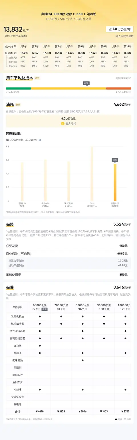 除了车辆本身的价值,我们还应该考虑日常使用过程中的用车成本。根据相关数据估算,这辆二手奔驰C级在每年的保养费用大约为3743元,这一数字适中,既考虑到了奔驰品牌的高品质要求,也兼顾了消费者的经济承受能力。在车险费用方面,每年约6531元的支出也是合理且必要的,它为您的行车安全提供了坚实的保障。至于日常油耗,我们已经提到,这辆车的百公里油耗为6.0L,按照每年行驶一万公里计算,每年的油费将约为4868元,这一数字在可接受范围内,且相对于同级别车型来说,还具有一定的节油优势。