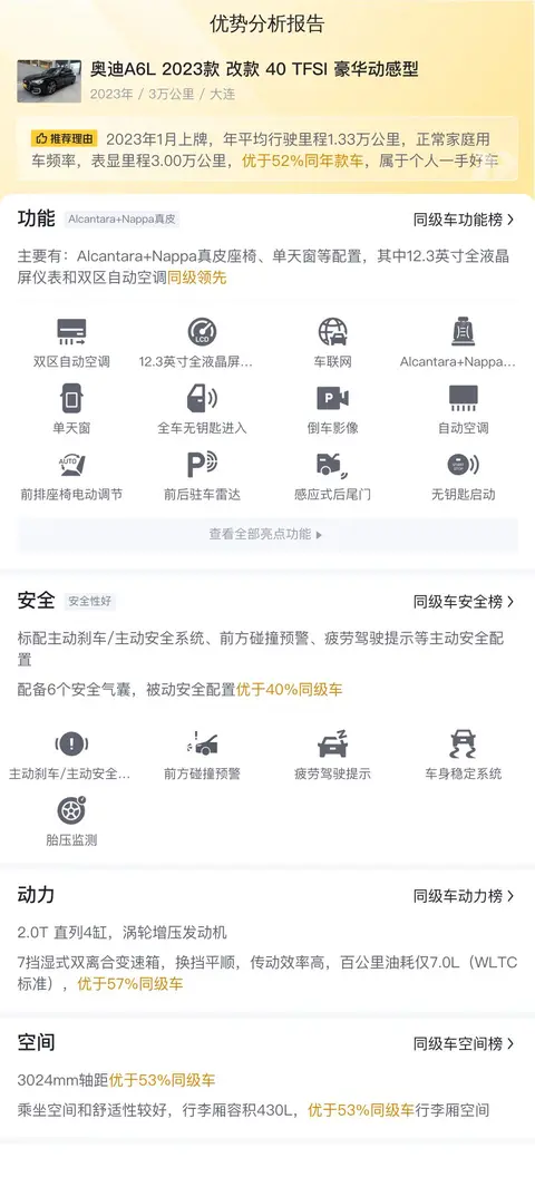 今天我们要介绍的这款奥迪A6L 2023款 改款 40 TFSI 豪华动感型二手车上牌地为大连,上牌日期2023年1月,表显里程3万公里,新车指导价42.79万,二手车报价27.98万,黑色车身,无过户。该车搭载2.0T直列4缸,涡轮增压发动机,匹配7挡湿式双离合变速箱,WLTC百公里油耗7.0L,纯电续航里程为(NEDC标准)。关于新车含税价、WLTC综合油耗、行李舱容积、天窗类型、四驱类型、电机类型、座椅材质、亮点配置、新车指导价、产地等信息,将在后续文章中详细介绍。