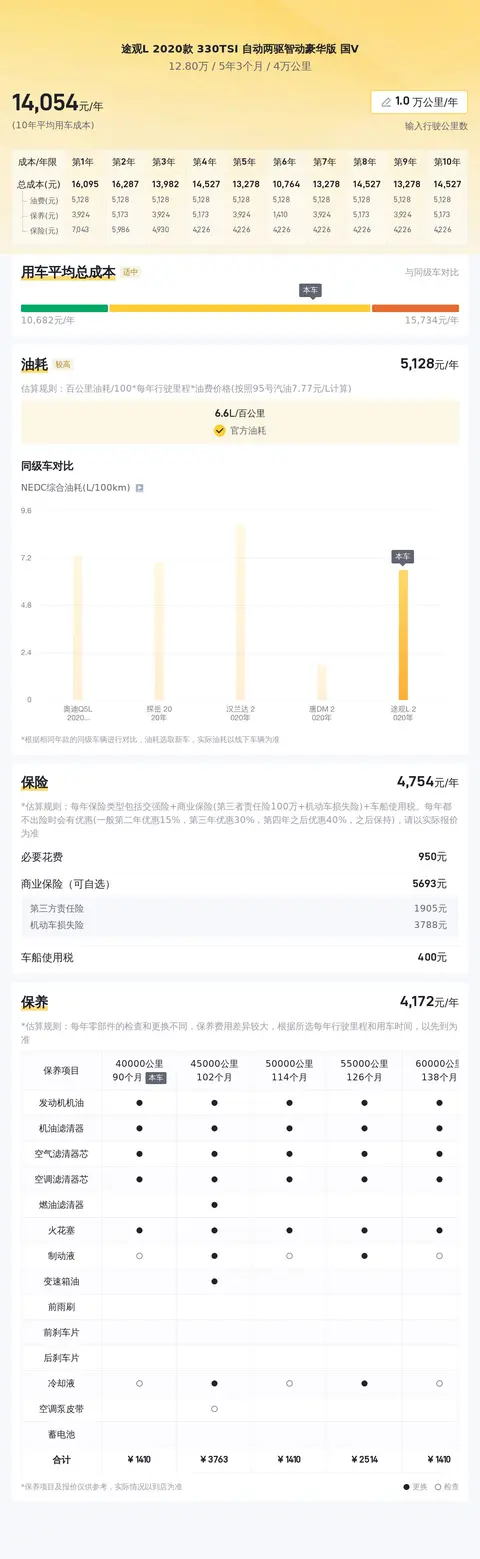 在用车成本方面,我们估算了这辆车的年均综合用车成本约为1.4万元左右。需要注意的是,实际费用支出可能会因个人驾驶习惯及车辆使用频率等因素而有所差异。