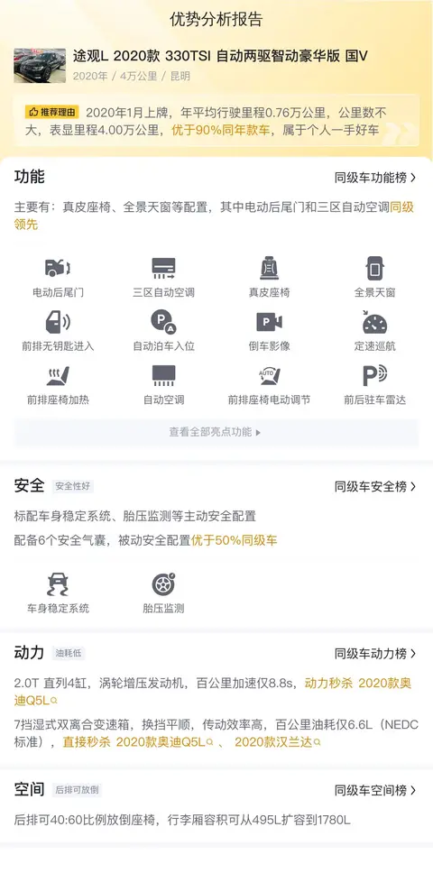 综上所述的新车含税价、用车成本、市场行情、优势分析、同款比价等数据仅供参考。在配置部分,因为二手车非标品,车辆可能会存在配置改装的情况,具体车况信息需要线下结合车辆实际情况进行综合参考。