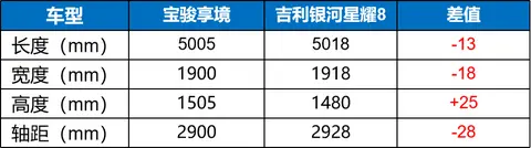 颜值这种主观的很难评,可尺寸这种实打实的,就很容易比较了。享境的长宽高分别为5005/1900/1505(插混)1490(纯电)mm,轴距为2900mm,较之星耀8的5018/1918/1480mm长宽高,2928mm轴距,它明显小一些。只不过差值都在1—2厘米之间,最高也没超3厘米,所以吉利在尺寸上赢得不多。