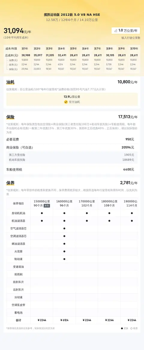 当前这款车的二手车行情大致在11.52万至14.77万之间,当然具体的售价因车辆状况而有所不同。就用车成本而言,该车官方公布的百公里油耗为13.9升,按每年行驶一万公里里程计算,结合当前油价计算,每年的油费约11478元,保养费用每年约8330元,保险费用每年约10779元,其他费用根据个人情况而定,总体来看,用车成本相对较高。