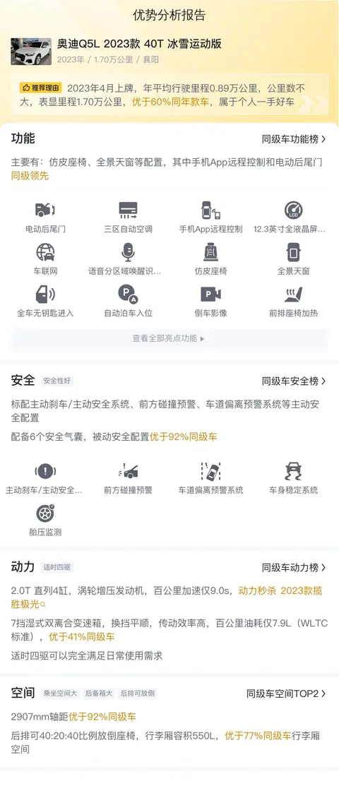 综上所述的新车含税价、用车成本、市场行情、优势分析、同款比价等数据仅供参考。在配置部分,因为二手车非标品,车辆可能会存在配置改装的情况,具体车况信息需要线下结合车辆实际情况进行综合参考。