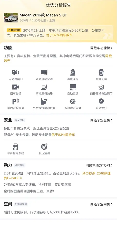 保时捷Macan(图片|配置|询价)自2014年首次亮相以来,一直是豪华紧凑型SUV领域的佼佼者。这款SUV以其卓越的性能和合理的价格吸引了无数消费者。2016款Macan 2.0T作为系列中的早期改进型号,继承了Macan家族的运动基因和豪华品质。这款车不仅象征着保时捷对驾驶乐趣的执着追求,也体现了其在细分市场的领导地位。今天给大家带来的这辆Macan 2016款 Macan 2.0T,可以看到这辆车的行驶里程为7.3万公里,上牌日期为2016年2月,过户次数为1次。该车新车指导价为55.8万,二手车报价16.58万,位于上海。