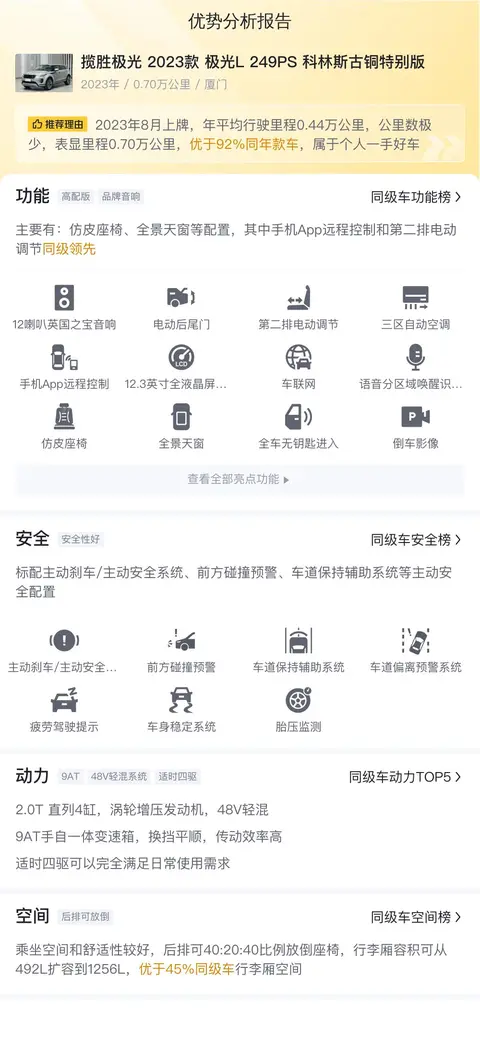 综上所述的新车含税价、用车成本、市场行情、优势分析、同款比价等数据仅供参考。在配置部分,因为二手车非标品,车辆可能会存在配置改装的情况,具体车况信息需要线下结合车辆实际情况进行综合参考。