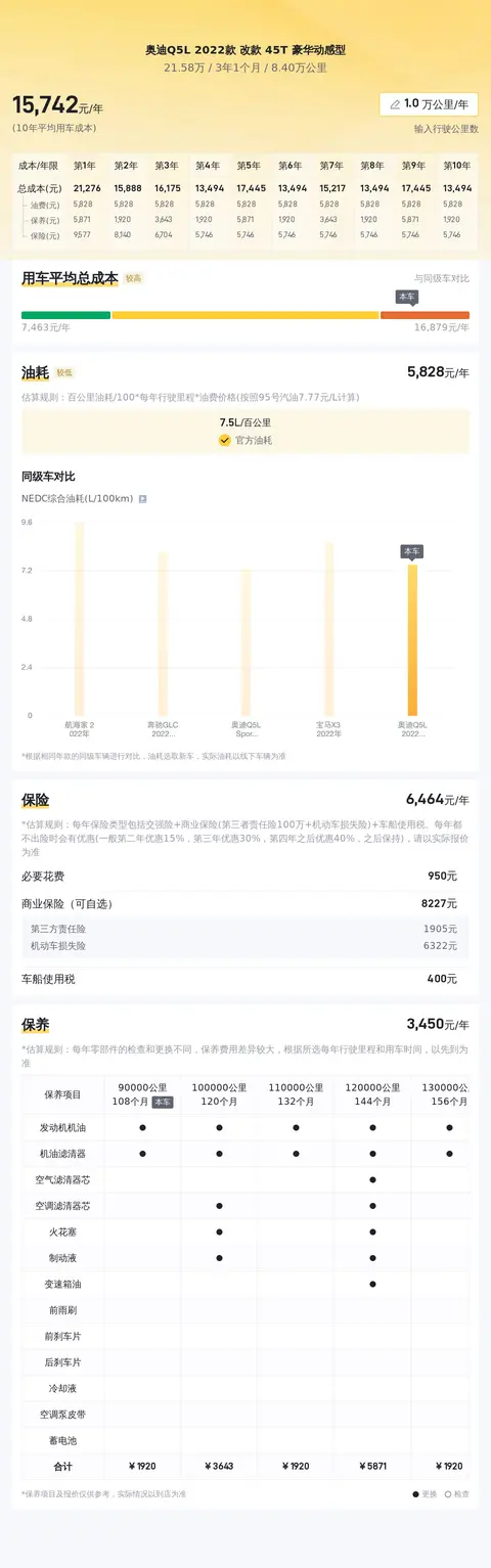 综上所述的新车含税价、用车成本、市场行情、优势分析、同款比价等数据仅供参考。在配置部分,因为二手车非标品,车辆可能会存在配置改装的情况,具体车况信息需要线下结合车辆实际情况进行综合参考。