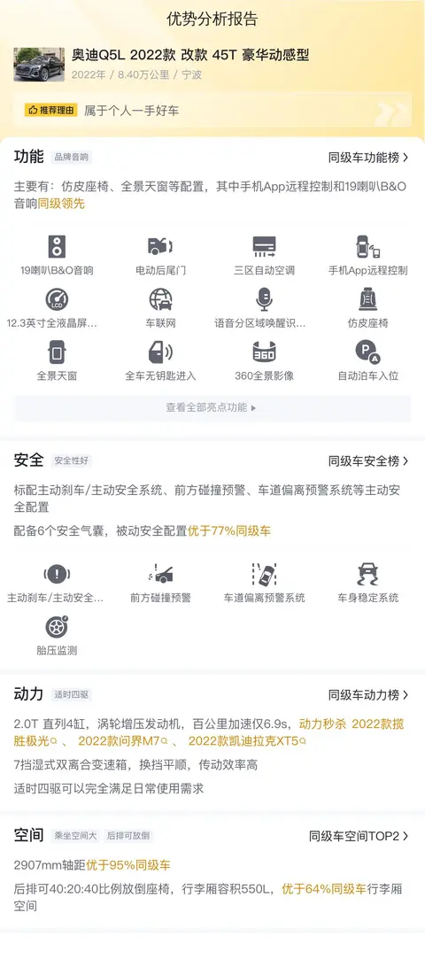 对于二手车市场而言,每一辆车的车况都独一无二。懂车帝利用自身技术优势,为消费者提供了市场行情、用车成本、优势分析及同款比价等全面数据,这些信息将帮助您做出更加明智的购车决策。奥迪Q5L 2022款 改款 45T 豪华动感型以其出色的性能、豪华的内饰和合理的价格,在二手车市场上具有较高的竞争力。无论您是家庭用户还是商务人士,它都能为您提供优质的出行体验。如果您正在寻找一款性价比高的中型豪华SUV,那么不妨考虑一下这款二手奥迪Q5L。