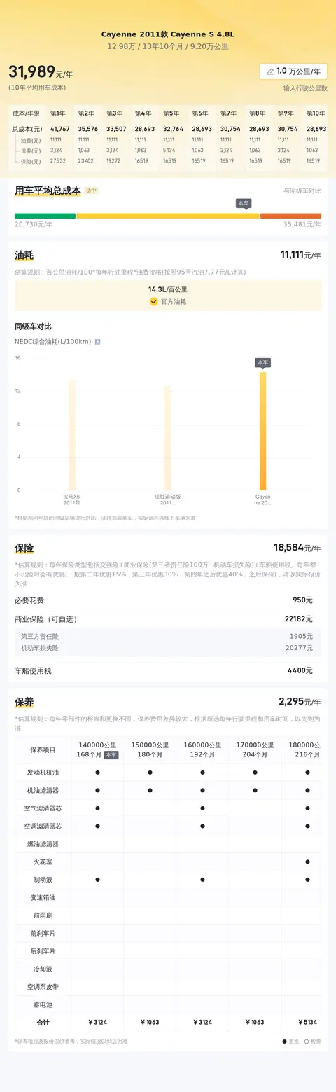 经过测算,这款Cayenne 2011款 Cayenne S 4.8L的十年平均用车成本约为32,188元/年,这其中包括油费、保险费及保养费等日常开支。值得一提的是,这一用车成本并未考虑车辆折旧费用,仅作实际用车成本的参考。