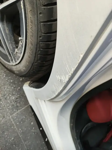 右后翼子板有剐蹭的情况,通过图片可以看到,右后翼子板的剐蹭较为严重,几乎需要进行钣金喷漆修复。不过好在这些瑕疵都属于车身覆盖件,并不会影响车辆的安全性。
