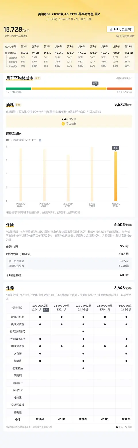 在不考虑其他费用大幅波动的情况下,我们可以合理估算奥迪 Q5L 每年的平均用车成本大约为 16169 元。这一估算基于几个固定的年费项目,包括车船使用税、保险费用以及常规保养支出。值得注意的是,这一成本估算并未纳入燃油费用,原因是日常通勤所需的油费会根据每个人的用车频率、行驶距离以及当地的油价波动而有所不同。然而,基于合理的假设和参数设置,我们可以近似计算得出奥迪 Q5L 每年的燃油消耗成本约为 11881 元。这一估算假设了车辆每年行驶 2 万公里的距离,并考虑了综合油耗等因素。实际上,油费支出可能会因个人驾驶习惯、车辆使用强度以及市场价格变动而有所调整。
