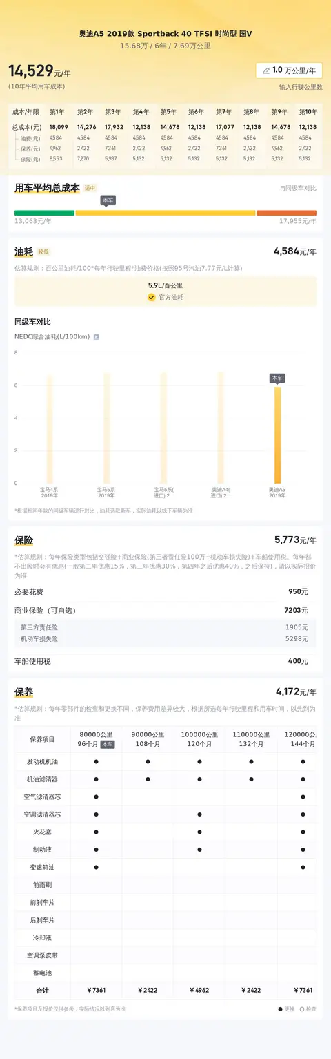 奥迪A5 2019款 Sportback 40 TFSI 时尚型的10年平均用车成本为14632元/年,相较于同级别车型,其油耗较低,保养费用适中,总体用车成本较为合理。