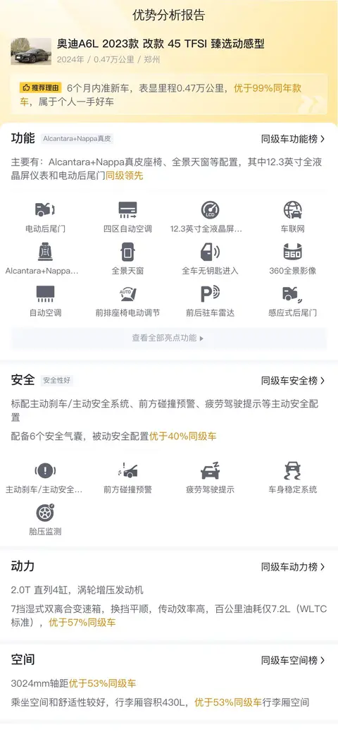 综上所述,奥迪A6L 2023款 改款 45 TFSI 臻选动感型凭借其出色的外观设计、豪华的内饰配置、强劲的动力性能以及丰富的智能驾驶辅助功能,成为了一款集豪华与性能于一体的座驾。如果您正在寻找一款既能满足日常出行需求又能提升生活品质的车型,那么奥迪A6L 2023款 改款 45 TFSI 臻选动感型绝对是一个值得考虑的选择。