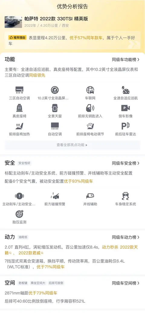 毕竟是2022款的车,所以配置也不会差到哪里去。帕萨特 2022款 330TSI 精英版配备了全速自适应巡航、真皮座椅、10.2英寸全液晶屏仪表、三区自动空调等配置。安全配置上,标配主动刹车/主动安全系统、前方碰撞预警、并线辅助等主动安全配置,配备6个安全气囊,被动安全配置优于77%同级车。