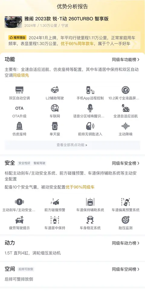 车况通过实拍图大家有简单的了解之后,会更关心这辆车的功能配置怎么样?有没有什么优势?这辆雅阁 2023款 锐·T动 260TURBO 智享版配有全速自适应巡航、车道居中保持、双区自动空调等配置,其中车道居中保持和双区自动空调同级领先。在安全性上,标配主动刹车/主动安全系统、前方碰撞预警、车道保持辅助系统等主动安全配置。相比2021款增加了L2驾驶辅助,减少了2个扬声器,少于2021款。在空间上,后排可整排放倒,行李厢容积586L,优于96%同级车行李厢空间。在座椅上,采用仿皮座椅,前排座椅加热,主驾驶位电动调节。在动力上,搭载1.5T 直列4缸,涡轮增压发动机,最大功率是141kW,最大扭矩是260N·m,同级领先。