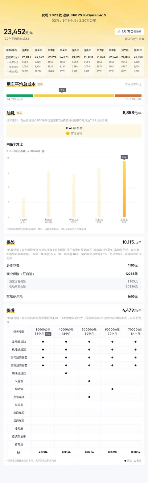 用车成本上,根据估算,这辆发现 2023款 改款 360PS R-Dynamic S 的年均综合用车成本约为2.3万元左右。这里说的用车成本啊,是指车辆的燃油费用加上保险费用再加上保养费用等一年下来的综合用车费用。好了,以上就是我们对这款车的全部介绍了。