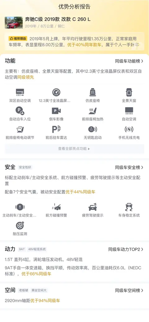 综上所述,奔驰C级2019款改款 C 260 L是一款集豪华、科技与性能于一身的中型轿车。它在内饰设计、动力系统以及配置丰富度等方面表现出色,为驾驶者和乘客带来了优质的驾乘体验。然而,在面对宝马3系和奥迪A4L等强劲对手时,奔驰C级在运动性能和科技感方面还有待提升。尽管如此,奔驰C级依旧是一款值得推荐的豪华中型车,适合追求高品质生活的消费者选择。