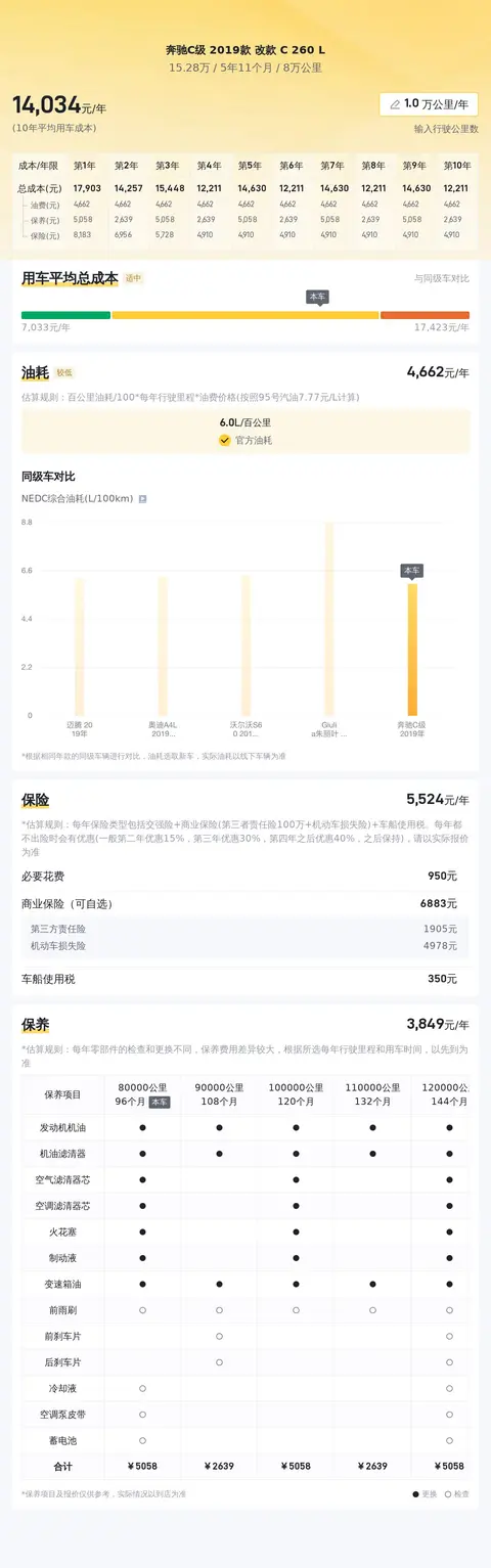 当前市场上,这款车型的二手车价格大约在15.7万至19.22万元之间。当然,具体的售价会受到车辆状况等因素的影响。至于用车成本方面,根据估算,这辆奔驰C级2019款改款 C 260 L的年均综合用车成本大约为每年1.4万元左右。这项费用涵盖了燃油、保险以及保养等方面的支出。需要注意的是,实际用车成本可能会因个人驾驶习惯
