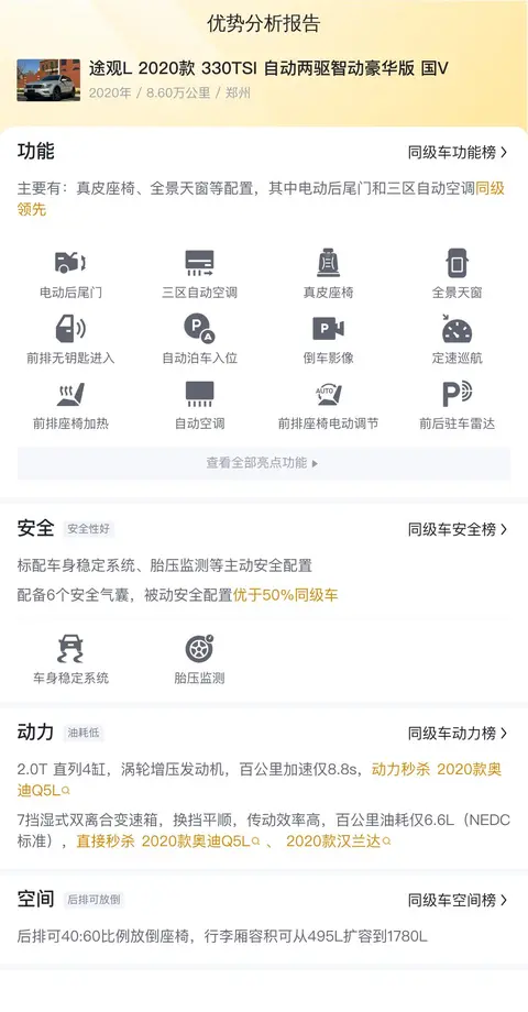 在看车况的时候,我们不光要看车辆的外观和内饰表现,还要看看这辆车的内在配置,也就是大家平时说的有什么好用的配置。毕竟,这直接决定了咱们用车的舒适性和便利性。这辆途观L 2020款 330TSI 自动两驱智动豪华版 国V配备了电动后尾门、三区自动空调等配置,其中三区自动空调更是能照顾到前后左右人的乘车舒适度,是个不错的配置。在安全配置上,这辆车标配疲劳驾驶提示、车身稳定系统、胎压监测等主动安全配置,配备6个安全气囊,被动安全配置优于93%同级车。