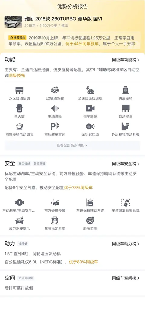 优点:热门车型,市场欢迎度高,保值率高,整体外形出众。里程低,使用时间短,安全配置丰富,有6个气囊,还配备了主动刹车系统,空间也比较宽敞,而且1.5T的发动机,动力和油耗也兼顾的不错。