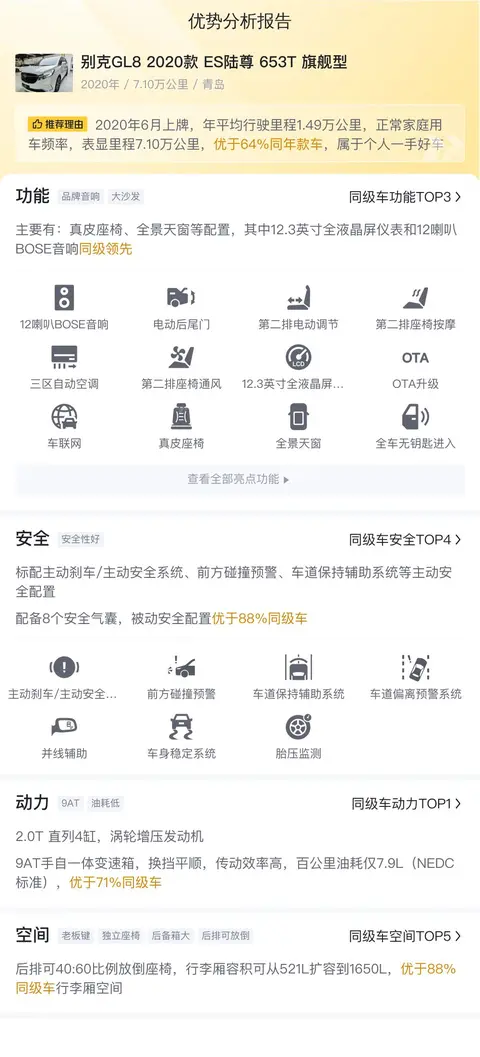 综上所述,别克GL8 2020款 ES陆尊 653T 旗舰型在二手车市场中是一款性价比较高的车型。它不仅拥有出色的外观设计和舒适的内饰配置,还具备强劲的动力性能和宽敞的空间布局。在选购时,建议消费者根据自身需求和预算进行综合考量,选择最适合自己的车型。