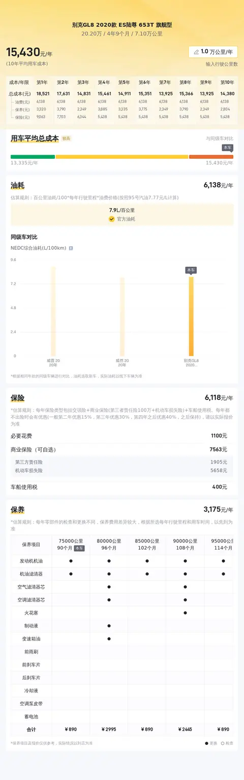 购置二手车不仅要考虑购车成本,还要纳入后期使用中的花费,包括油费、保险费以及保养费等。根据估算,别克GL8 2020款 ES陆尊 653T 旗舰型的年均综合使用成本大约为15188元,但这一数字会因个人使用习惯及车辆维护情况等因素而有所波动。