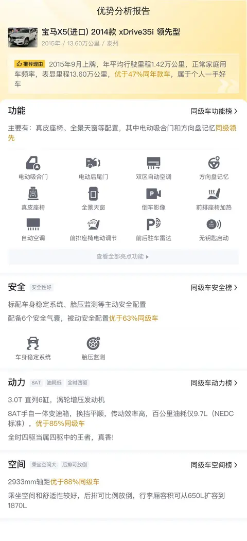 在二手车市场行情部分,根据懂车帝大数据分析,这辆车具有较为明显的价格优势。结合车辆的车龄、里程数及车况等信息,当前这辆二手宝马X5的价格设置合理且有竞争力,为潜在买家提供了良好的购入时机。