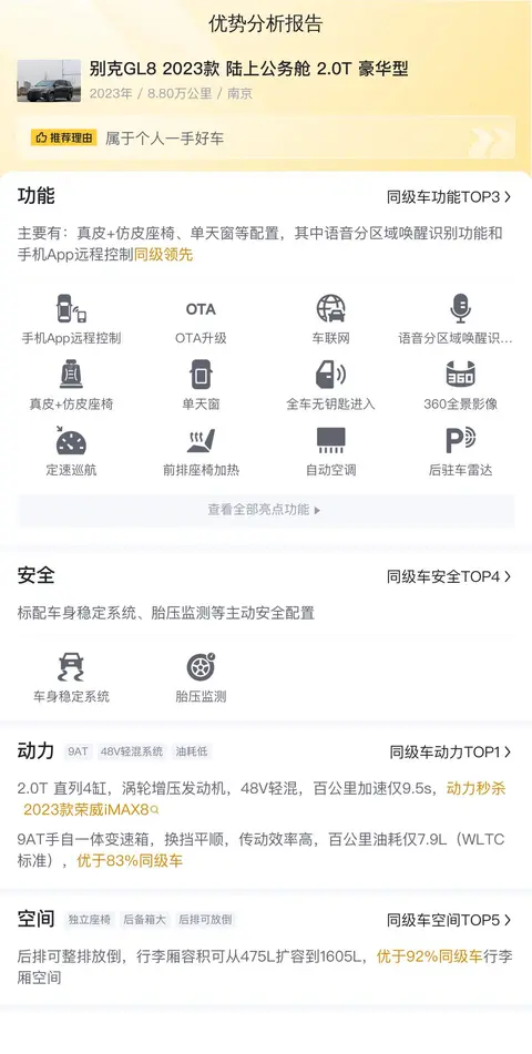 别克GL8(图片|配置|询价) 2023款 陆上公务舱 2.0T 豪华型是一款高档商务车,以其卓越的性能和舒适性在市场中占据重要地位。这款车搭载了先进的动力系统,提供强劲而平稳的驾驶体验,同时拥有宽敞的内部空间和丰富的配置,满足高端商务人士的需求。在安全性方面,这款车配备了多项主动和被动安全措施,确保乘客的安全。总体而言,别克GL8 2023款 陆上公务舱 2.0T 豪华型凭借其出色的性能、舒适性和安全性,在同类车型中表现出色,是一款值得推荐的高档商务车。今天我们就为您带来一辆二手别克GL8 2023款 陆上公务舱 2.0T 豪华型,带您深入了解一下这款车的风采。