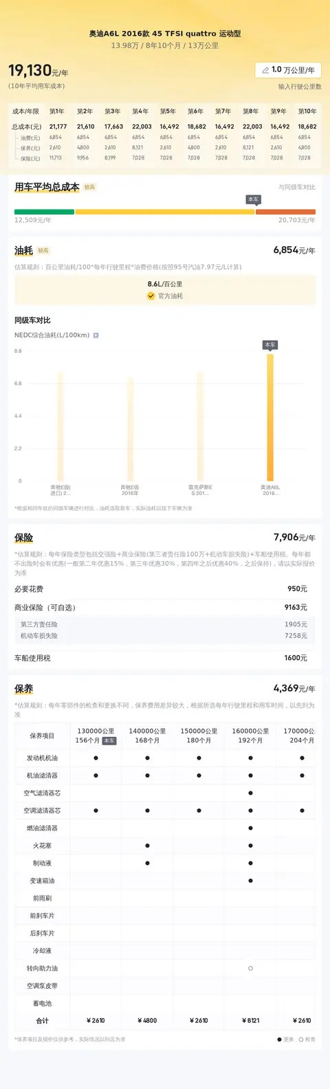 购买二手车不仅要考虑购车成本,也要计算日常使用成本,我们为您统计了这款车的用车成本,以及保养费用、保险费用等开支情况。