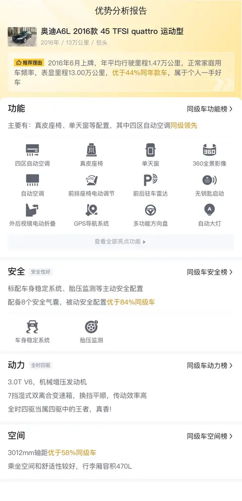 该车具体参数为奥迪A6L2016款45TFSIquattro运动型,搭载3.0T310马力V6发动机,机械增压,最大功率228kW,最大扭矩400N·m,百公里加速仅6.5秒,配7挡双离合变速箱,动力强劲,提速快,超越大部分同级车。同时,全时四驱系统为车辆提供卓越的操控性和稳定性,让驾驶更加轻松自如。轴距3012mm,优于58%同级车,乘坐空间和舒适性较好,行李厢容积470L,优于89%同级车行李厢空间,前后多连杆式独立悬挂,保持车辆行驶的平稳与舒适。此外,该车还配备了多功能方向盘、真皮座椅、车载冰箱等豪华配置,以及ABS防抱死、制动力分配、刹车辅助等主动安全配置,全方位保障驾乘安全。黑色车身不仅彰显出沉稳大气的商务风范,更在视觉上提升了车辆的档次感。