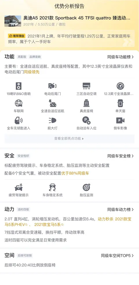在选择二手车时,车况始终是买家最为关注的核心要素。如果无法亲自查看车辆,那么了解以下信息变得尤为重要:这辆A5的上牌时间为2021年1月,至今行驶了5.5万公里,且未曾有过过户记录。其当前报价为21.58万元,相比新车指导价优惠了26.4万元。值得一提的是,根据市场数据,当这辆车再行驶2年后,预计仍能以16万元的价格出售,显示出了良好的保值率。考虑到其保值能力,这辆车的购买价值更为突出。