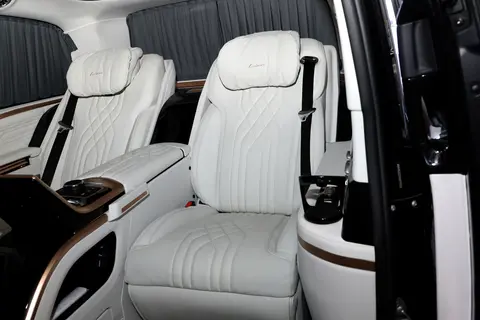 内饰方面,2025款Lorinser VS600MX湾流·四座车型或在中控台饰板、方向盘等细节使用仿碳纤维纹路。同时,该车座椅使用真皮与翻毛皮包裹,除配色和材质调整外,其前排设计预计与原厂新款奔驰V级一致。