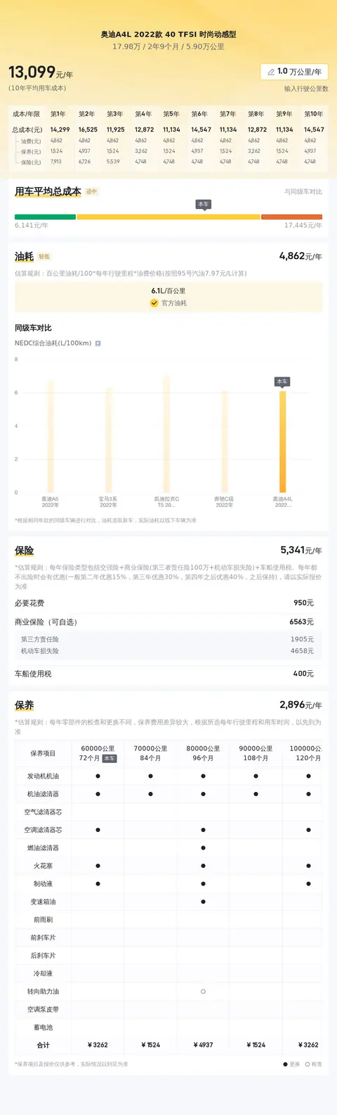 所介绍的是一款奥迪A4L 2022款 40 TFSI 时尚动感型,属于中型轿车类别,采用前置前驱的驱动方式,搭载了2.0T涡轮增压发动机和7速湿式双离合变速箱。车身尺寸为长4858mm、宽1847mm、高1439mm,轴距达到2908mm,提供了宽敞的内部空间和舒适的乘坐体验。官方数据显示,从静止加速至100公里/小时仅需8.2秒,展现了其不俗的动力响应。NEDC综合油耗为6.1L/100km,体现了较高的燃油经济性。