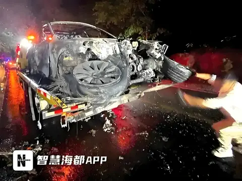 从网友拍摄的画面中,能看到事故现场的惨烈:原本完整的三厢轿车,车尾被撞得几乎消失,像是被一只无形的巨手硬生生削去,整个车身只剩下焦黑的框架,被烈焰包裹。一旁的红色重型卡车,车头也有明显的撞击损伤,不难想象当时撞击的剧烈程度。