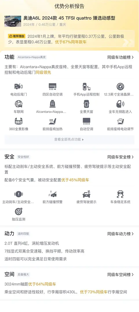 首先来了解下这辆车的基本信息,该车的具体版本是:奥迪 A6L 2024 款 45 TFSI quattro 臻选动感型,表显里程 4.6 万公里,上牌地重庆,有1次过户记录。新车指导价 47.99 万,而现在的二手车报价仅为 34.8 万。