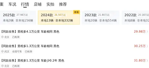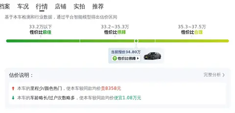 接下来是市场行情部分,根据大数据统计,与这辆车同款或者类似的车型,市场价格基本都在32.6万至39.66万之间,而我们这辆二手车的报价34.8万正好位于这个合理的市场区间之内,价格并无明显优势,但车况非常优秀。