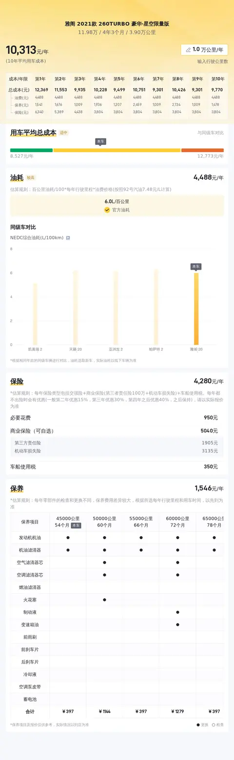 据估算,同级车的用车成本最低是5198元/年,最高是12798元/年,雅阁 2021款 260TURBO 豪华·星空限量版是9981元/年,不算低,但也不算高。
