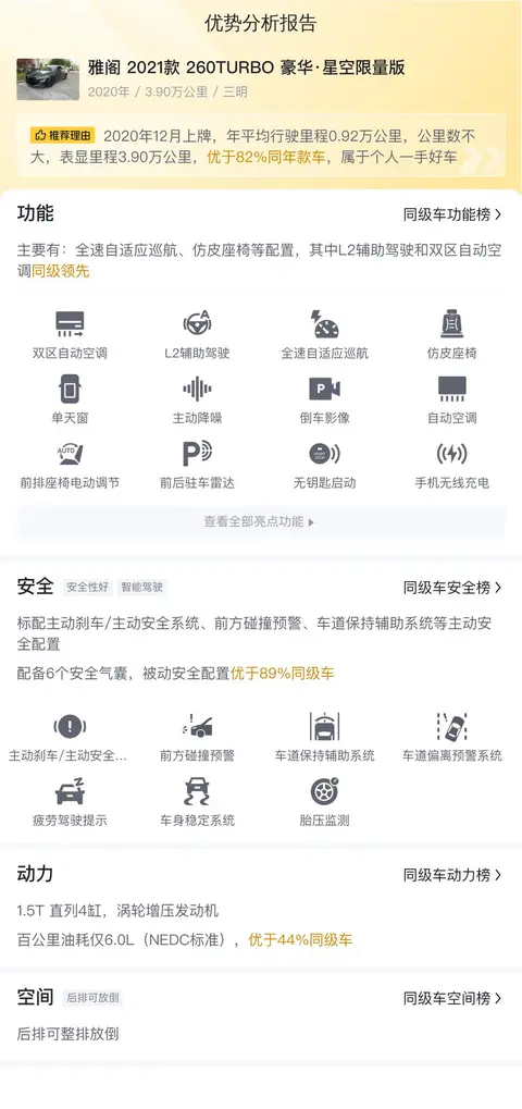 综上所述的新车含税价、用车成本、市场行情、优势分析、同款比价等数据仅供参考。在配置部分,因为二手车非标品,车辆可能会存在配置改装的情况,具体车况信息需要线下结合车辆实际情况进行综合参考。