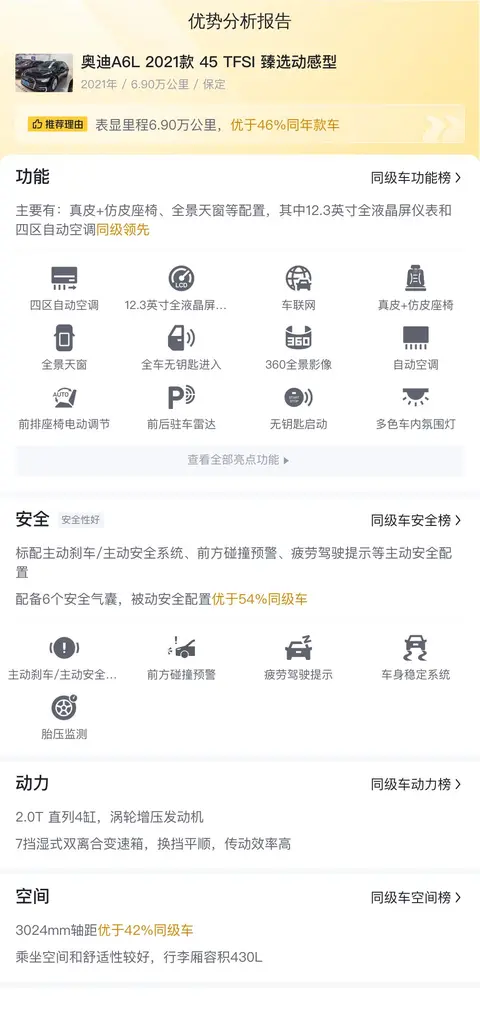 综上所述,奥迪A6L凭借卓越的舒适性和宽敞的内部空间,成为了一款理想的商务和家庭用车。无论是外观设计、内饰配置还是动力性能等方面,A6L都展现出了奥迪品牌的实力和魅力。如果您正在寻找一款高品质的中大型车,那么奥迪A6L绝对是一个值得考虑的选择。当然,每一辆二手车都有其独特状况,只有综合车况等信息,才能判断价格是否合理。