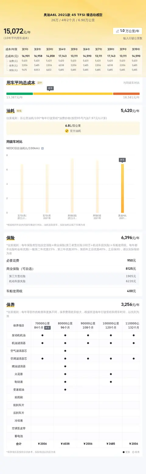 奥迪A6L车系为全国中大型车销量榜Top3,市场认可度极高。关于二手车价格,懂车帝大数据分析,综合性价比指数73%,预计再行驶2年后可卖18万,约折价27.5%。此车里程为6.90万公里,多于均值0.3万公里,车龄3年2个月,多于均值0.2年,过户次数1次,多于均值0.5次,颜色为黑色,综合性价比指数73%。可见影响价格的主要因素为车龄、里程、过户次数。按每年行驶2万公里计算,燃油费用约12813元,保养费用约4880元,保险费用约5388元,总用车成本约23079元,用车成本与同级别车相比处于适中水准。