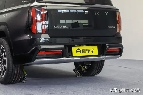 车尾部分,瑞虎9L量产概念车采用竖向布局的尾灯组以及高位刹车灯,尾门位置加入大尺寸“CHERY”字母标识,左下角“9L”表明身份信息,后包围下侧加入银色装饰件。