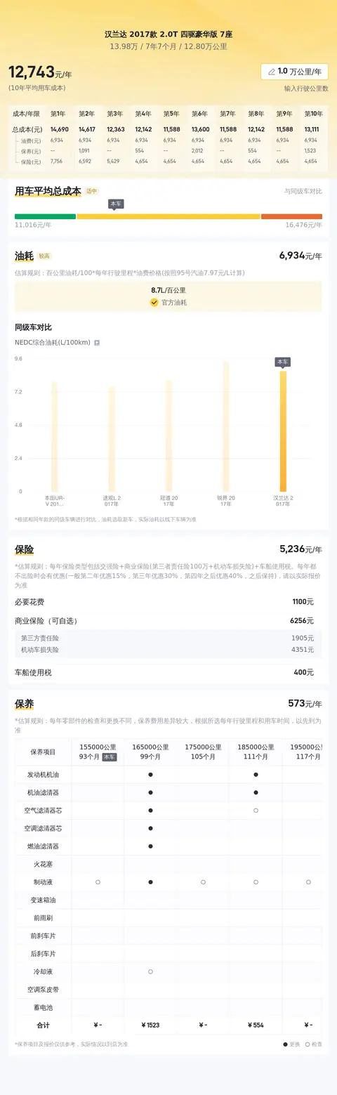 二手车市场错综复杂,但根据当前市场行情,这辆汉兰达的售价显得相当亲民,且因其良好的保养状况和合理的里程数,性价比凸显。当然,最终的车价还要综合车辆实际情况等多重因素来确定。在用车成本方面,根据估算,这辆车的年均综合用车成本在1.3万元左右,具体的实际费用开销会根据车主的使用习惯和行车环境等因素有所变动。