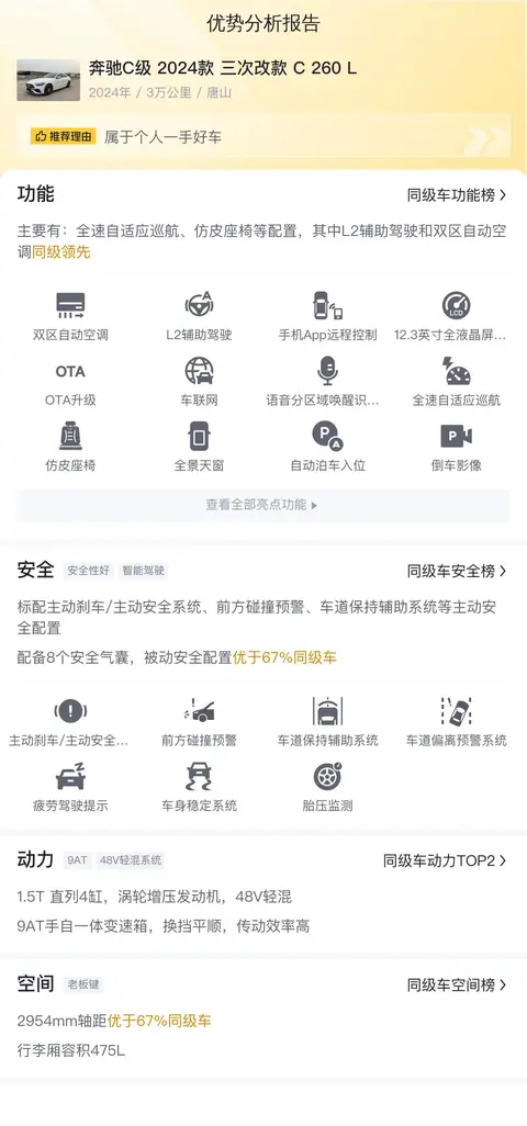 首先来了解一下这辆车的基本信息,该车的具体版本是——奔驰C级 2024款 改款三次 C 260 L。该车是白色外观,上牌地、车源地均在唐山,上牌日期2024年2月,表显里程3万公里,个人一手车未过户,新车指导价35.5万,目前二手车报价24.68万,接下来看看这辆车的车况信息。