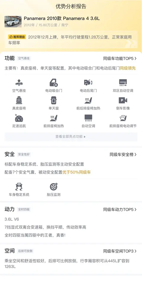 这辆二手保时捷Panamera的具体版本是——2010款 Panamera 4 3.6L,首次上牌时间为2012年12月,有过1次过户记录,上牌地为南宁,表显里程为15.8万公里。新车时期的指导售价为125.2万元,而当前的二手车报价为16.68万元。车身颜色为白色,采用四门掀背的车身结构。