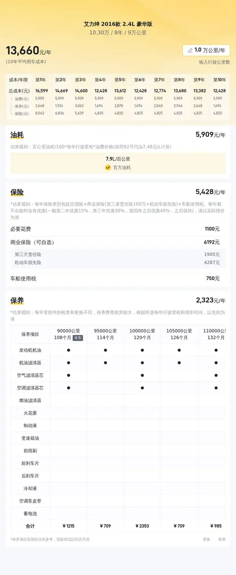 当前市场上,这款二手艾力绅的价位大致介于10.3万至12.7万元之间。当然,具体的成交价还需根据车辆状况及其他因素评估。关于用车成本方面,预估的年均综合用车成本约为1.4万元(按每年行驶2万公里计算)。然而,实际支出可能会因多种因素而有所不同。