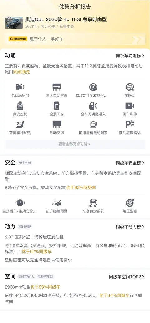 配置上,该车配有真皮座椅、全景天窗等,特别值得一提的是其12.3英寸全液晶屏仪表和电动后尾门,这两项配置在同级别车型中处于领先地位。动力方面,该车搭载2.0T直列4缸涡轮增压发动机,匹配7挡湿式双离合变速箱,百公里油耗仅为7.1L(NEDC标准),优于52%同级别车型。此外,适时四驱系统能够满足日常各种驾驶需求。空间方面,Q5L拥有2908mm的轴距,优于83%同级别车型。其后排座椅可40:20:40比例放倒,行李厢容积达550L,优于44%同级别车型行李厢空间。