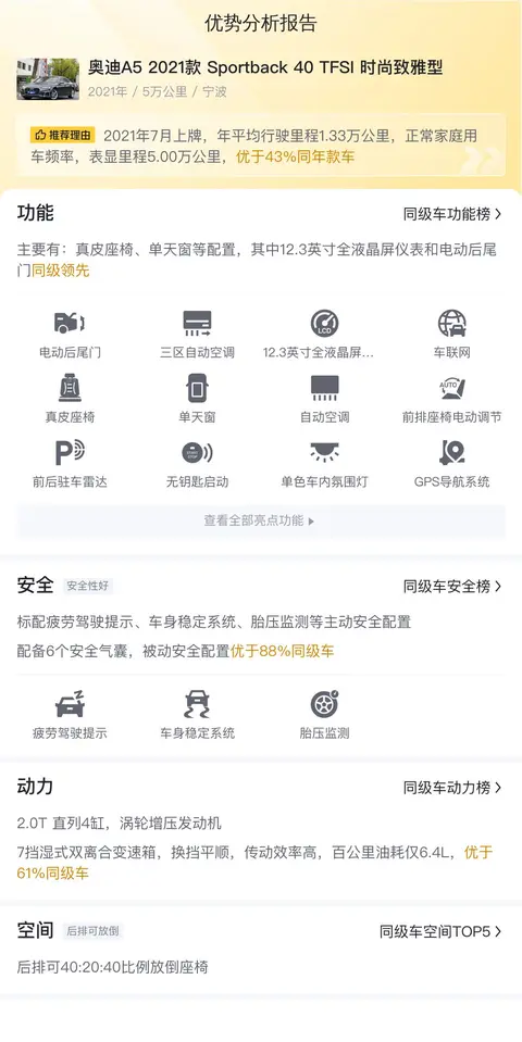 奥迪A5(图片|配置|询价)系列车型诞生于2007年,它的推出填补了奥迪在高端四门跑车市场的空白。作为一款介于奥迪A4与奥迪A6之间的车型,A5的出现丰富了消费者在这一细分市场的选择。此外,奥迪A5的推出也是为了满足市场对于高端四门跑车日益增长的需求,其独特的设计和卓越的性能表现赢得了消费者的广泛认可。今天我们就为您带来一辆二手奥迪A5,具体版本为奥迪A5 2021款 Sportback 40 TFSI 时尚致雅型。
